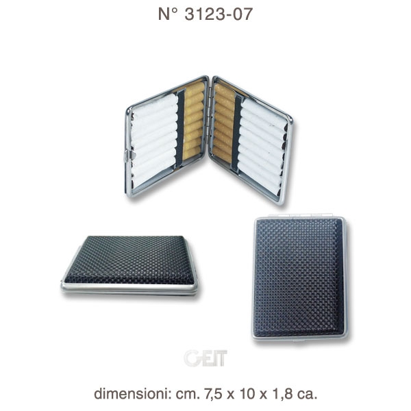 In metallo. Superficie esterna di colore NERO con disegno intrecciato. Con alloggiamento per sigarette da ambo i lati. Contiene 16 sigarette corte (8 per lato).